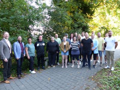 Begrüßten die Teilnehmer des 8. Soldatenlehrgangs: Studienleiter Lars Gölz (l.) und die Sachbearbeiterin Doreen Wulff (3. v. l.) vom Niederlausitzer Studieninstitut für kommunale Verwaltung sowie der nebenamtliche Dozent Timo Ziomkowski (2. v. l.). Foto: Evelyn Stöwer (NLSI).