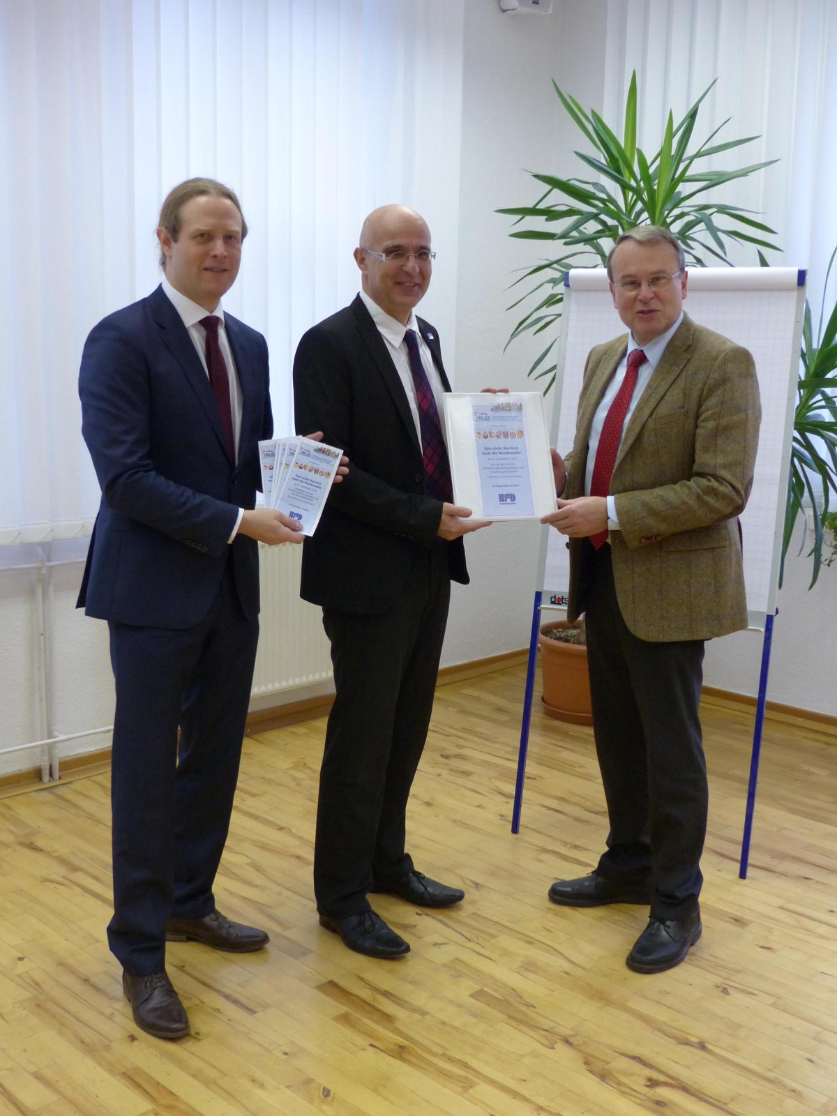 Freuten sich über die Kooperation: (v. r.) Verbandsvorsteher des Zweckverbandes Niederlausitzer Studieninstitut für kommunale Verwaltung (NLSI), Landrat Rolf Lindemann, der Leiter des Kundenservices des Berufsförderungsdienstes Berlin, Gerald Langner, und der Studienleiter des NLSI, Lars Gölz. Foto: NLSI.